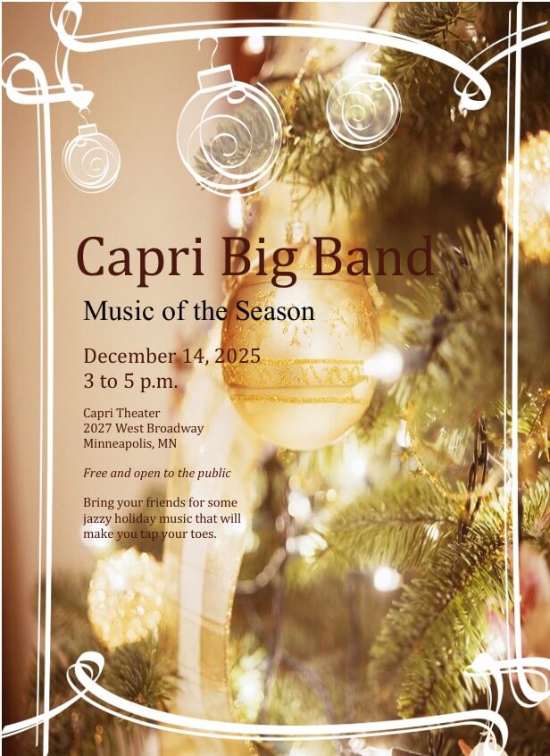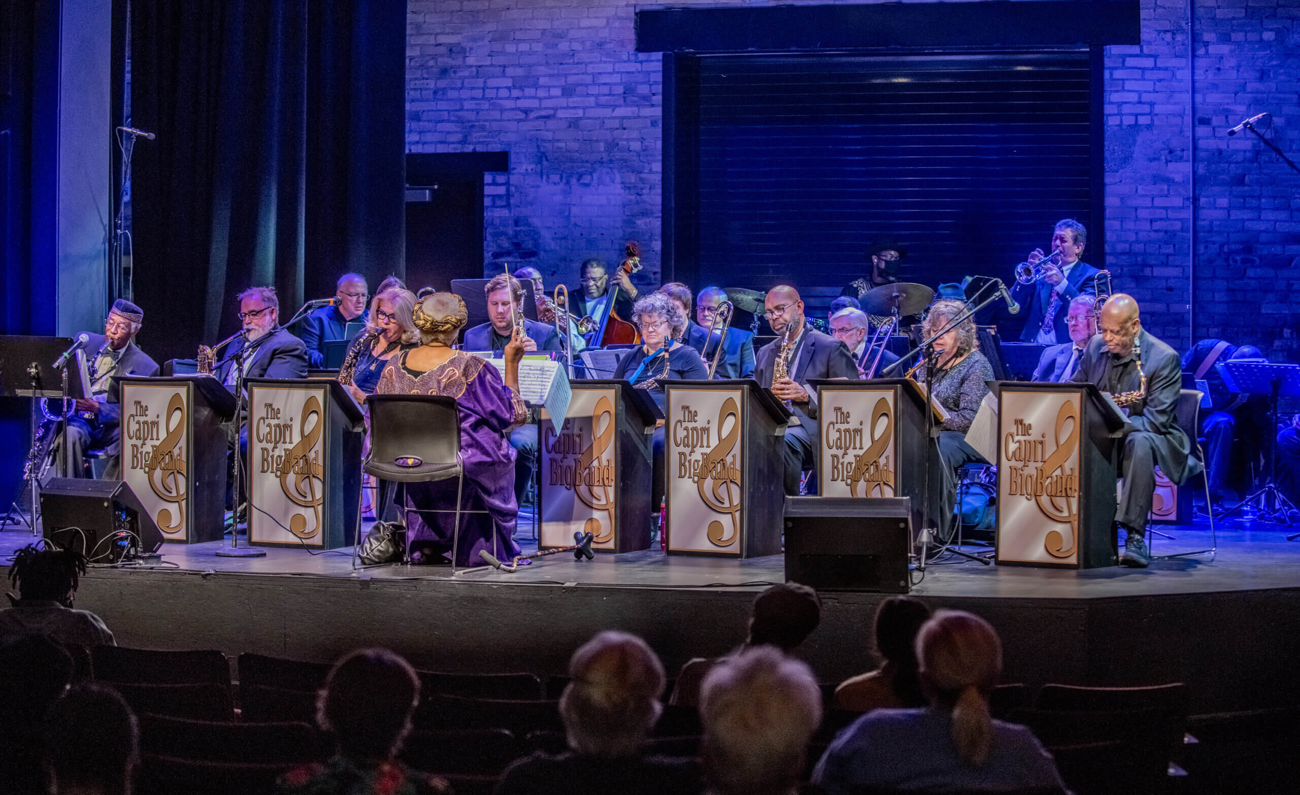 Since 2007, the Capri Big Band has been rehearsing at the Capri Theater on most Wednesday nights. We’ve been so pleased to have their music and collective energy in our theater for so long, and are excited to have them perform during our Grand Opening Week!