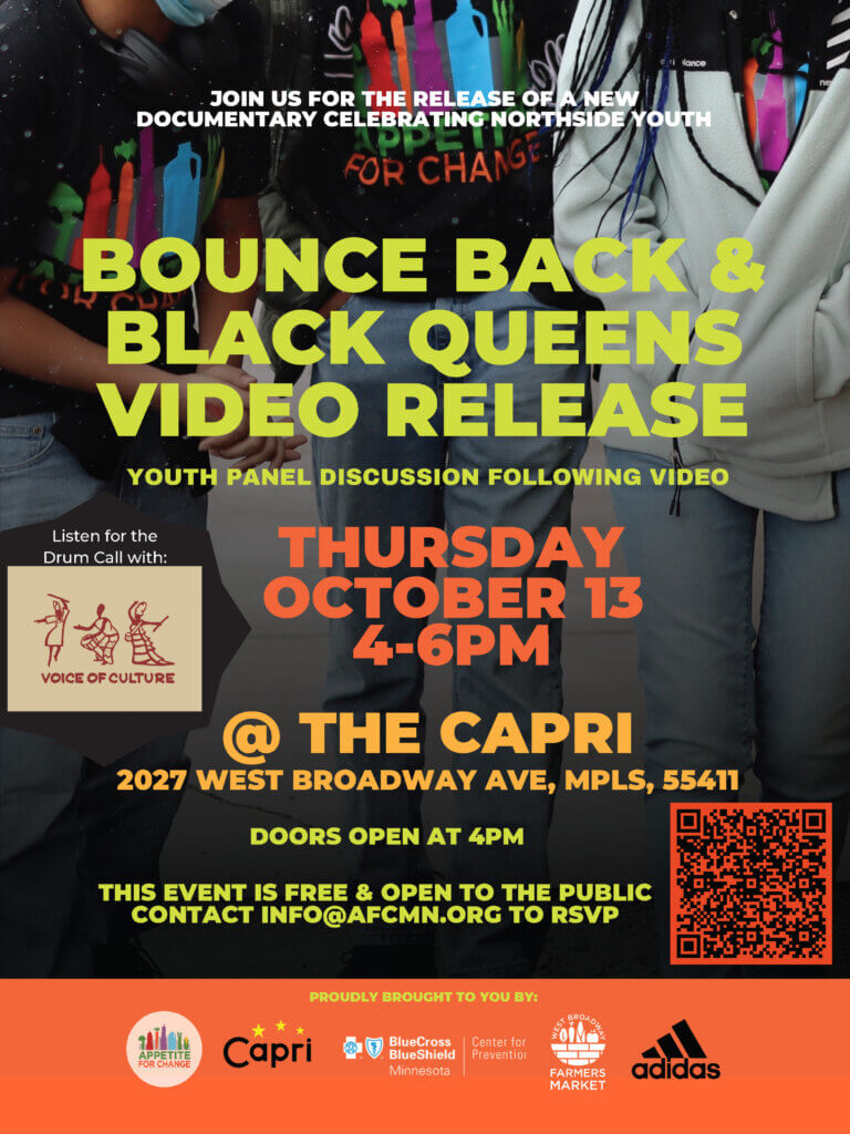 Join Appetite For Change at the Capri Theater for our video release of Bounce Back and Black Queens, a YTOP (Youth Training and Opportunity Program) grant-funded, retrospective video involving the youth who created Grow Food.