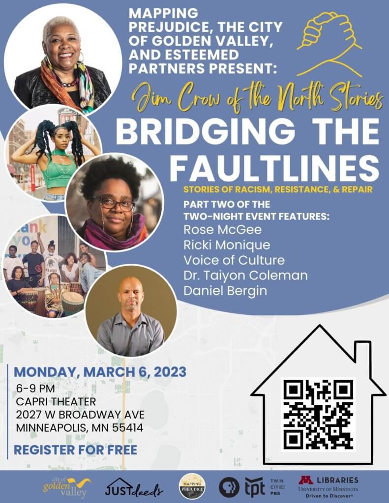 Mapping Prejudice and the University of Minnesota Libraries, City of Golden Valley, Just Deeds, and TPT invite community members to come together to “Bridge the Faultlines” between the adjacent communities of Golden Valley and North Minneapolis. For decades, these two cities have been divided through racist covenants in property deeds and purposeful segregation.
