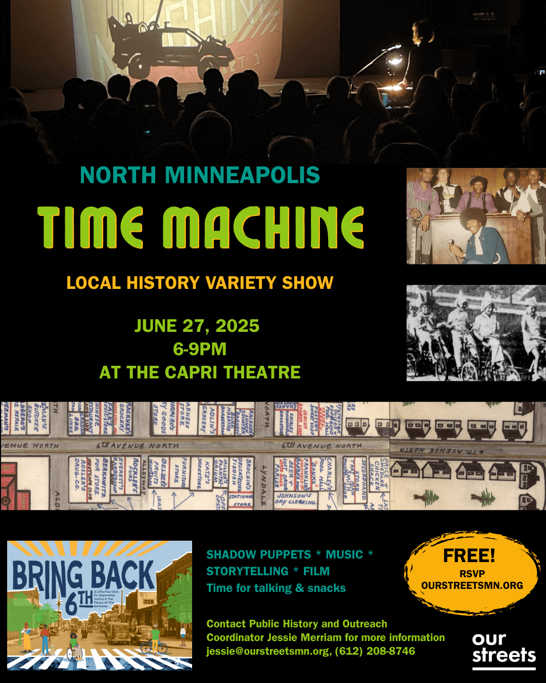 Join us for a tour through time, through overhead projector shadow puppets, storytelling, music, film interviews, and tables of maps and library secrets. Based on similar events in Cedar Riverside, this “Time Machine” will share stories and images of Near North Minneapolis’ early days up to the present, and share information on present-day advocacy efforts around “Bring Back 6th.” The history of the Olson Memorial Highway corridor helps us understands the rich history here as well as the harms of the past, to better inform our future.