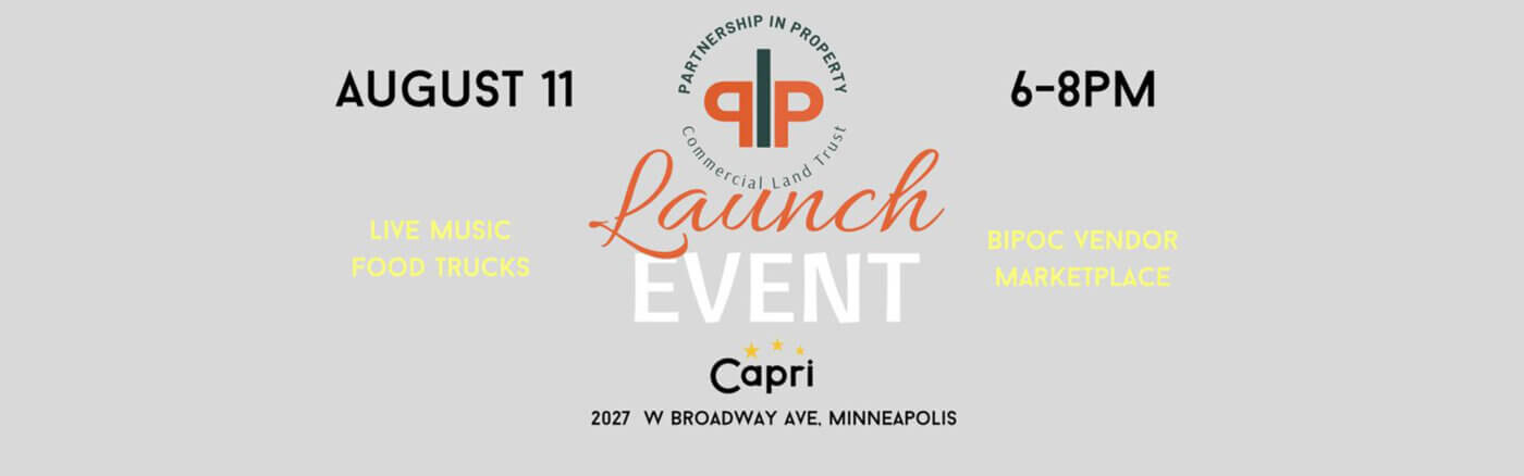 Partnership in Property Commercial Land Trust (PIPCLT) is hosting a launch event on Thursday, August 11, 2022 at the Capri Theater in North Minneapolis. We want to tell you what we’ve been up to, where we’re going, and why you should join us in this important work!