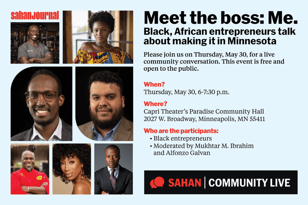 That’s why Sahan Journal is bringing together a panel of Black entrepreneurs who are making it in Minnesota. On May 30 at 6 p.m., Sahan’s founder and CEO Mukhtar M. Ibrahim and reporter Alfonzo Galvan will moderate a community conversation exploring how Black immigrants can overcome challenges to become bosses in Minnesota.