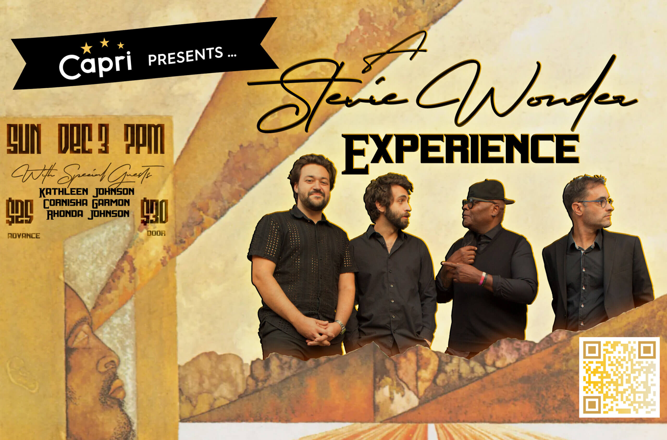 They’ll be playin’ some hits and some of the B-sides — the great Stevie Wonder songs that you may not have heard often (unless you, as a huge fan, did), bringing a musical, magical evening of Wonder-ous tunes to you @ the Capri!