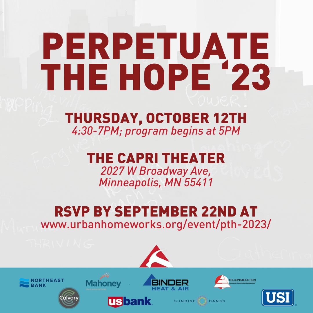 Urban Homeworks’ 20th annual Perpetuate the Hope fundraiser will take place on Thursday, October 12 from 4:30-7PM at the historic Capri Theater in North Minneapolis!