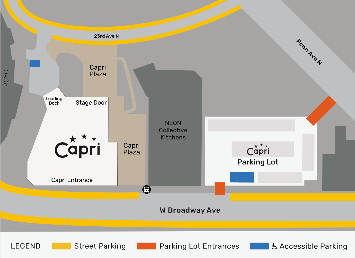 Street Parking: Additional parking is available on West Broadway and 23rd Avenue North (located behind the theater).