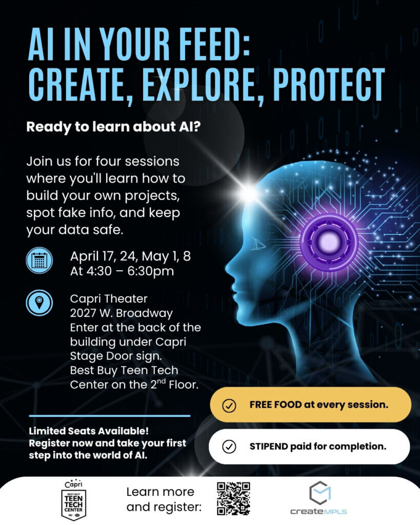 All students age 13 – 19 are welcome to join our Capri Best Buy Teen Tech Center. It’s FREE, but membership is required. Please fill out the membership form, below. Questions? Need more information? Call 612-643-2095.